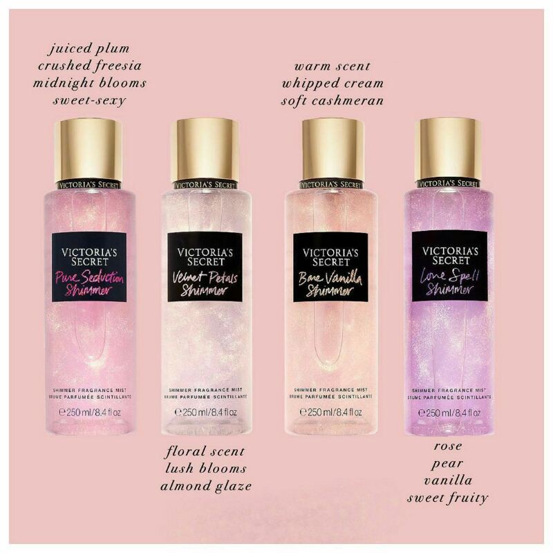 RM2900 Pure seduction shimmer Bare vanilla shimmer Velvet petals shimmer Love spells shimmer. Shake well to activate the shimmer. This Just Peachy Shimmering Body Mist is about to become your new must-have.